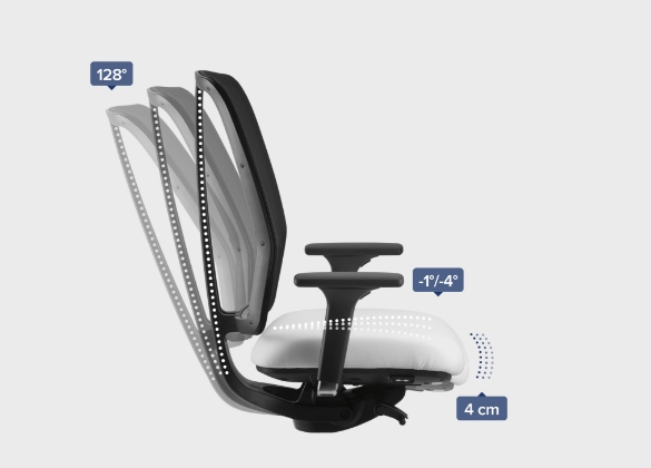 - Großer Öffnungswinkel der Rückenlehne zum Sitz (128°) für eine größtmögliche Entspannung des Be-Sitzers, besonders in der hinteren Sitzhaltung und Arbeitsposition