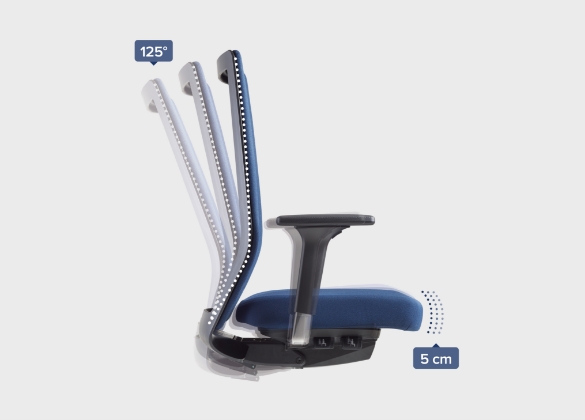 - Automatische Neigeverstellung von Sitz (bis -4° nach vorn) und Rückenlehne (bis 122° nach hinten), in der Nullstellung arretierbar, fördert die natürlichen Bewegungsimpulse, hält die Konzentrationsfähigkeit aufrecht und steigert die Leistungsfähigkeit des Be-Sitzers