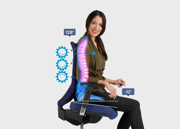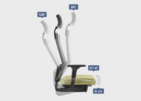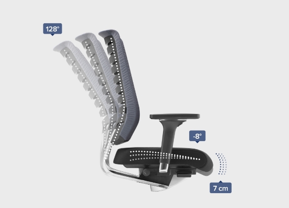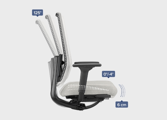 - Automatische Neigeverstellung von Sitz (bis -8° nach vorn) und Rückenlehne (bis 128° nach hinten), mehrfach arretierbar, fördert die natürlichen Bewegungsimpulse, hält die Konzentrationsfähigkeit aufrecht und steigert die Leistungsfähigkeit des Be-Sitzers