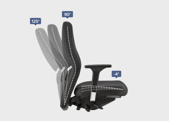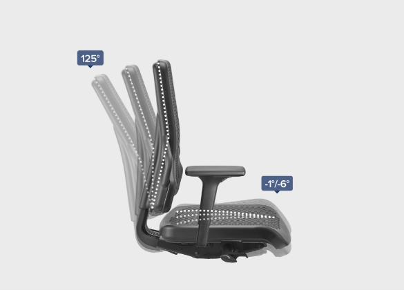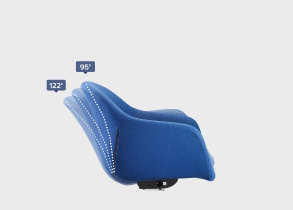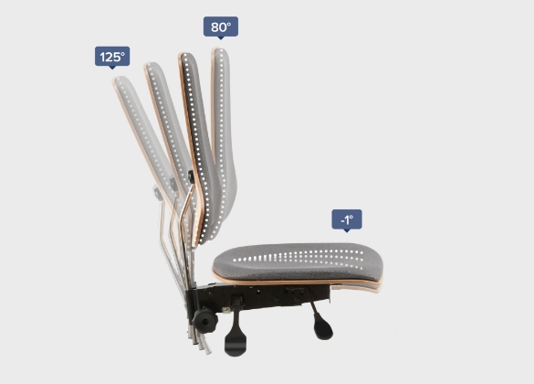- Großer Öffnungswinkel der Rückenlehne zum Sitz (128°) für eine größtmögliche Entspannung des Be-Sitzers, besonders in der hinteren Sitzhaltung und Arbeitsposition