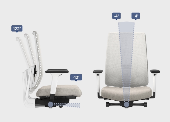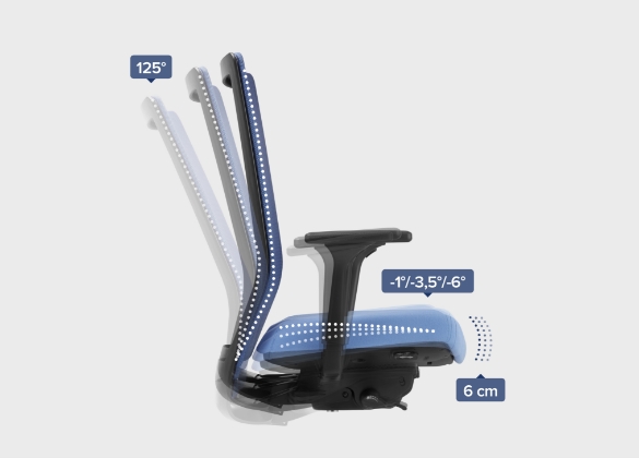 - Automatische Neigeverstellung von Sitz (bis -4° nach vorn) und Rückenlehne (bis 122° nach hinten), in der Nullstellung arretierbar, fördert die natürlichen Bewegungsimpulse, hält die Konzentrationsfähigkeit aufrecht und steigert die Leistungsfähigkeit des Be-Sitzers