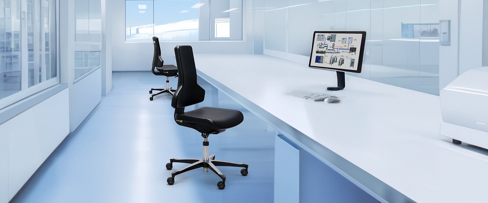 Reinheit und Funktionalität. Der Reinraum erfordert äußerste Sorgfalt bei der Möblierung. Neben der Notwendigkeit einer äußerst niedrigen Emission selbst kleinster Partikel muss die elektrostatische Ableitfähigkeit garantiert sein. Glatte Oberflächen, versiegelte Polster, verdeckte Mechaniken und ableitfähige Materialien: Unsere für den Reinraum entwickelten Modelle werden all diesen Ansprüchen hervorragend gerecht.