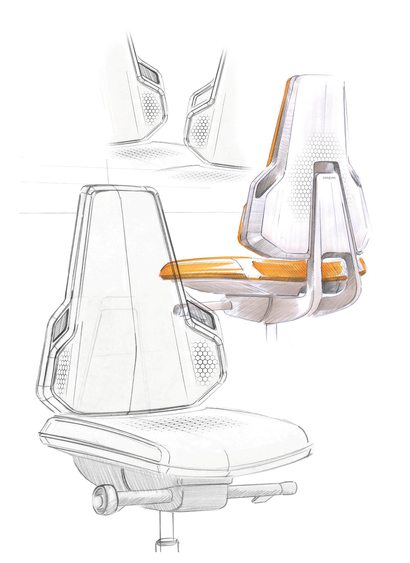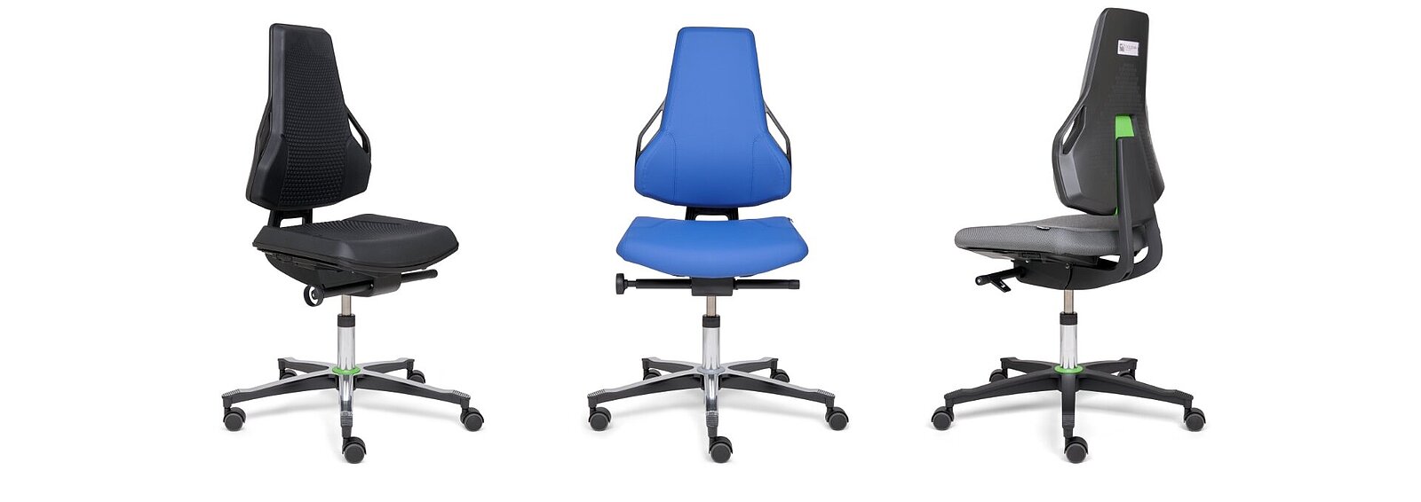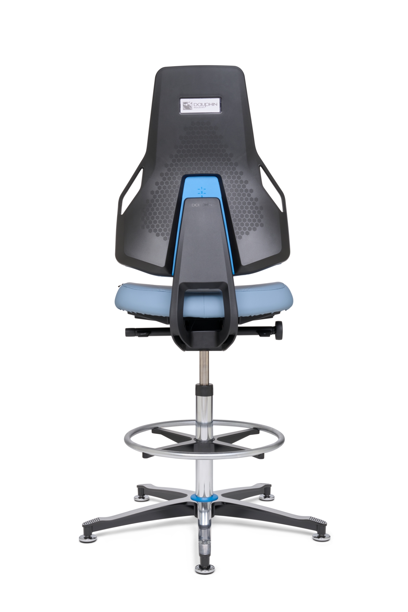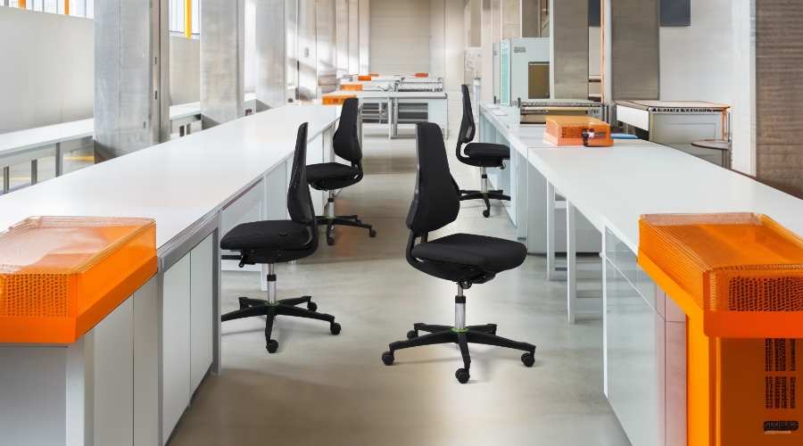 Sechs Farboptionen ermöglichen an Rückenlehne und Fußkreuz eine klare Kennzeichnung je nach Arbeitsbereich.