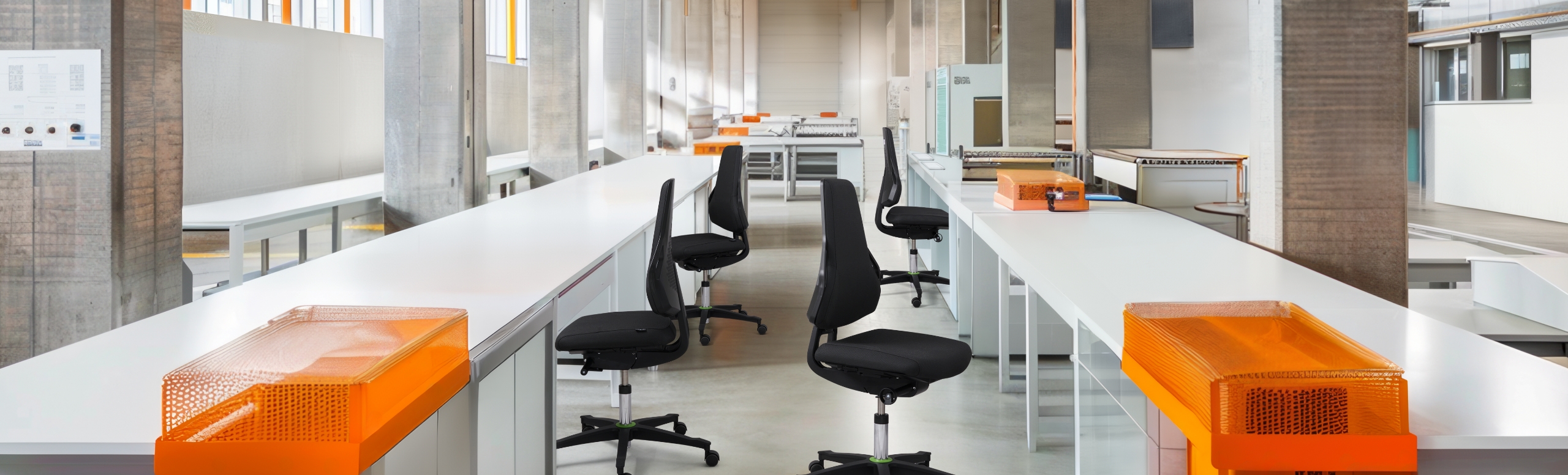 In the fields of research, industry and commerce, there are areas with special requirements in terms of safety, materials and durability. The work chairs, stools and products for the laboratory, standing-(seat) workstations or 24-hour use from this range caters for all the specific conditions in these instances. They also guarantee the highest level of safety, comfort and performance for users throughout their working-day, e.g. in production halls, chip manufacturing or chemical laboratories.