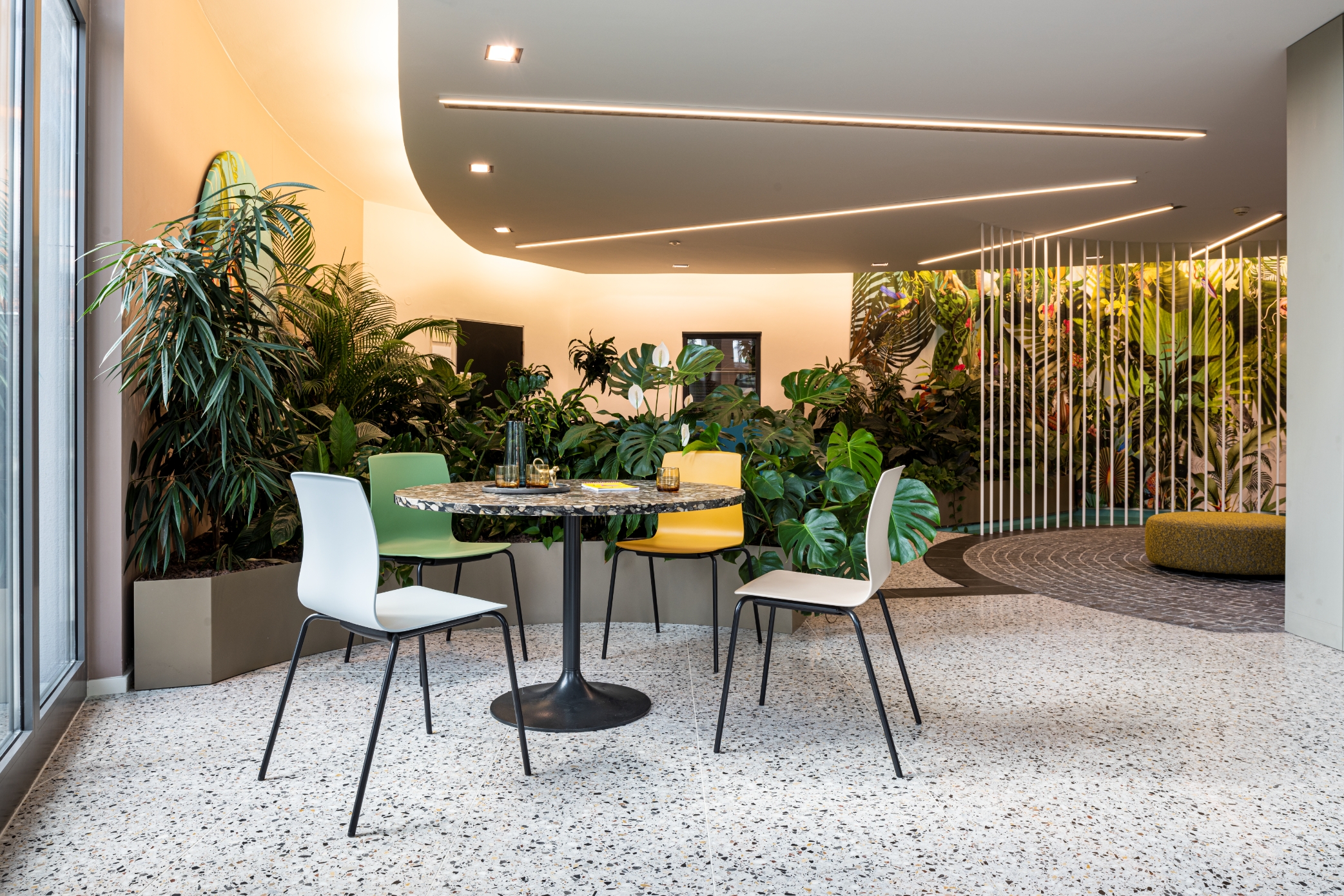 In canteens and central areas, Fiore demonstrates its versatility both as a cantilever chair, skid frame chair, four-legged chair, bar stool and as a nesting chair. Thanks to the option to stack or nest the chair, it can be stored away so as to save space.