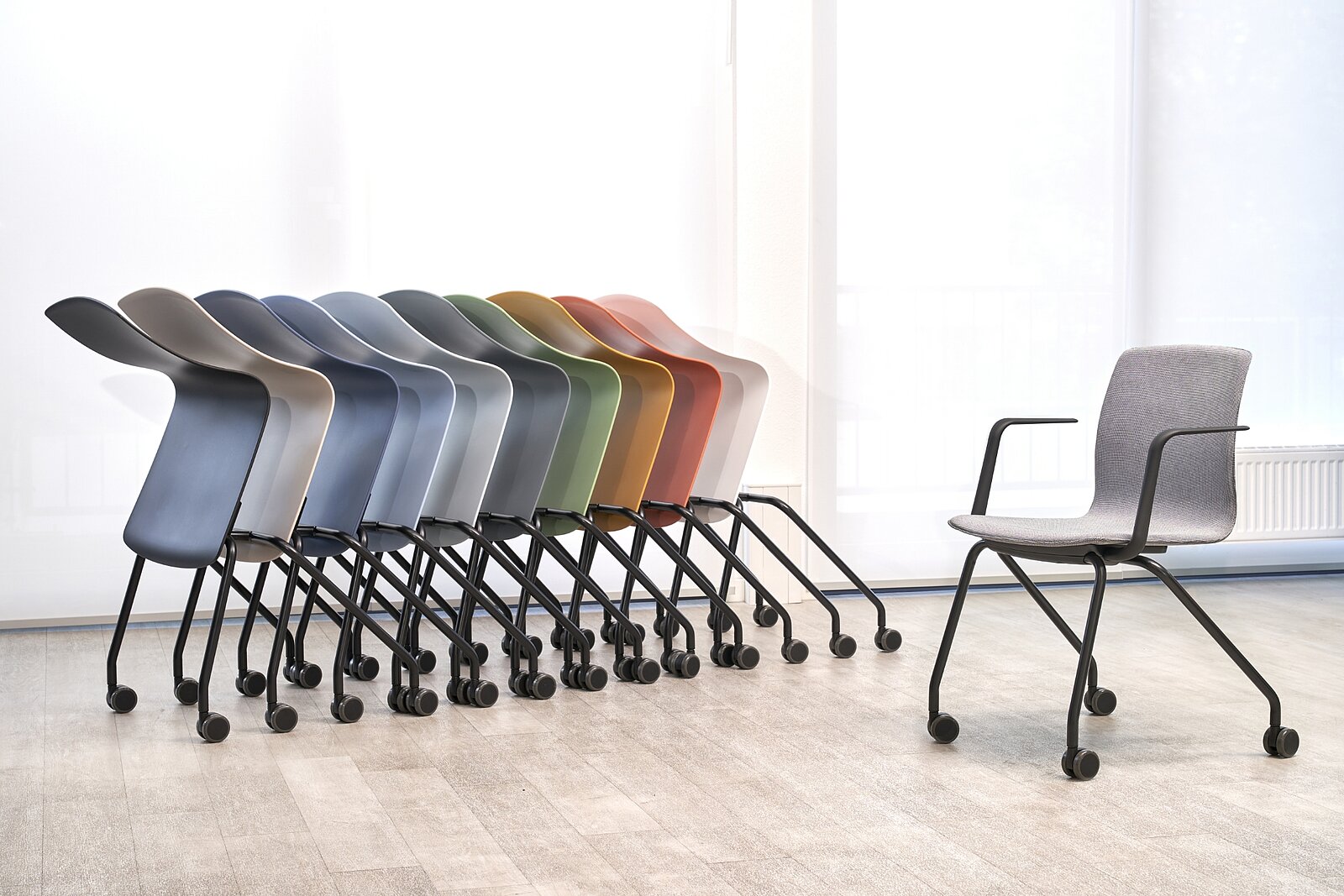 Fiore nesting adapts to any working environment with its choice of colours and materials, and can be nested and stored in a space-saving manner even when it is equipped with armrests or writing tablet.